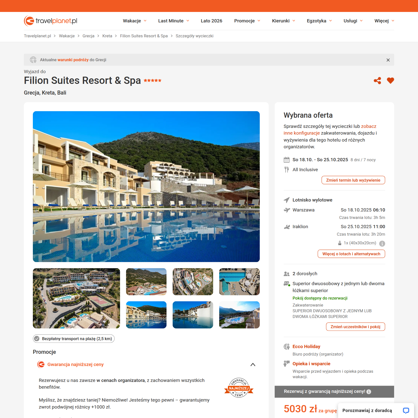Wylot na Kretę zaplanowany jest z Warszawy na 18 października, a powrót tydzień później, 25 października. W cenie wyjazdu otrzymujesz mały bagaż podręczny o wymiarach 40x30x20 cm.