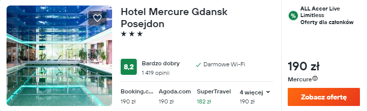 Na początek propozycja nad morzem. 3* Mercure Gdańsk Posejdon będzie świetnym wyborem dla osób, które chciałyby połączyć zwiedzanie z długimi spacerami wzdłuż plaży.
