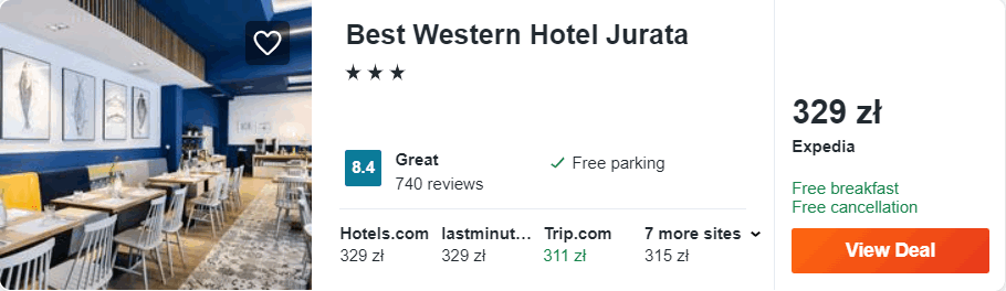 Następny na liście jest 3* hotel Best Western Jurata, który jak sama nazwa wskazuje, mieści się w Juracie. Jest on świetnie położony pośród sosnowego lasu, w odległości 350 metrów od plaży nad Morzem Bałtyckim. Dostęp do krytego basenu, sieci WiFi oraz codzienne śniadania – to będziecie mieli zapewnione w cenie pobytu.
