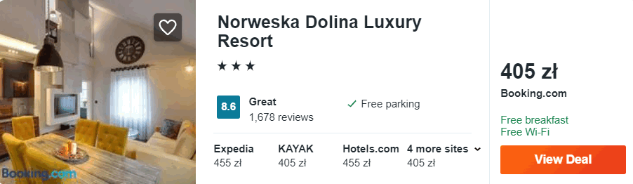 Pozostajemy na południu, ale przenosimy się w okolice Karkonoskiego Parku Narodowego, gdzie proponuję wam noclegi w 3* Norweska Dolina Luxury Resort, który położony jest w Szklarskiej Porębie. Codzienne śniadania, dostęp do krytego basenu oraz centrum wellness – to zapewnione macie w cenie pobytu.
