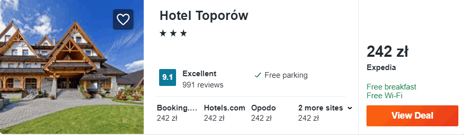 Na początek Podhale, gdzie rekomenduję wam noclegi z codziennymi śniadaniami w 3* hotelu Toporów. Ten znakomity obiekt mieści się w Białce Tatrzańskiej i swoim gościom zapewnia dostęp do dwóch krytych basenów, strefy wellness, darmowego miejsca parkingowego oraz sieci WiFi.