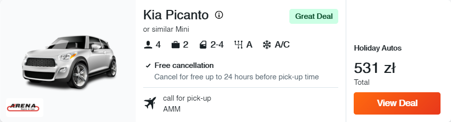 Zwiedzanie Jordanii ułatwi wam wypożyczony samochód. W przypadku tej podróży polecam wam samochód marki Kia (model Picanto lub inne auto zbliżonej klasy).