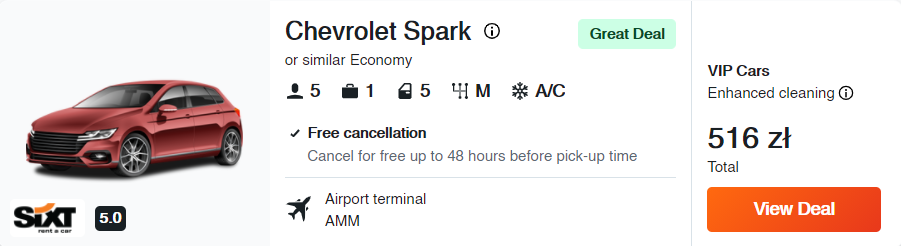 Zwiedzanie Jordanii ułatwi wam wypożyczony samochód. W przypadku tej podróży polecam wam samochód marki Chevrolet (model Spark lub inne auto zbliżonej klasy).