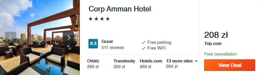 Dowiedzcie się więcej o tym hoteluPo wylądowaniu w stolicy nie uciekajcie od razu na południe! Jeżeli zdecydujecie się na zwiedzanie miasta, zatrzymajcie się w 4* hotelu Corp Amman. Wszystkie pokoje w obiekcie są klimatyzowane i wyposażone w prywatne łazienki. Co więcej, w obiekcie znajduje się bar na dachu, z którego będziecie mogli podziwiać piękną panoramę (zwłaszcza wieczorną porą).