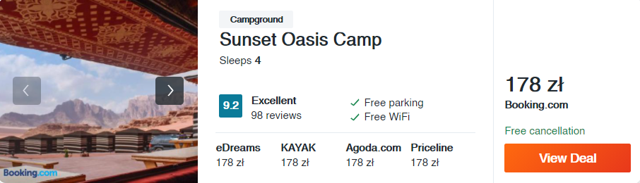 Będąc w Jordanii musicie spróbować noclegu na pustyni. W tym celu zarezerwujcie pobyt w Sunset Oasis Camp. Na terenie całego kempingu działa bezpłatne Wi-Fi oraz restauracja, w której codziennie serwowane są smaczne śniadania. Możecie także skorzystać z wycieczki po Wadi Rum, oferowanej przez obiekt.