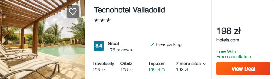 W Meksyku natomiast polecam wam wybrać się do Valladolid. To świetna baza wypadowa na pobliskie cenoty i starożytne ruiny Majów. Na miejscu zatrzymajcie się w 3* obiekcie Tecnohotel, który oprócz basenu i komfortowych warunków oferuje także bezpłatne Wi-Fi.