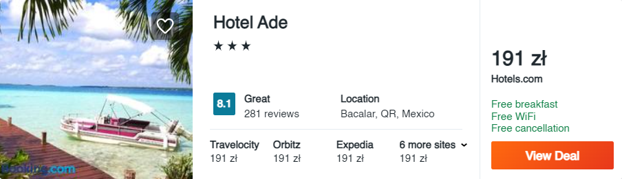 Pragniecie zobaczyć niezwykłe jezioro Bacalar? Na miejscu na swój pobyt wybierzcie 3* hotel Ade, który może pochwalić się świetnymi opiniami wśród dotychczasowych gości m.in. ze względu na swoją lokalizację. Co więcej, w cenę pobytu wliczono smaczne śniadania.