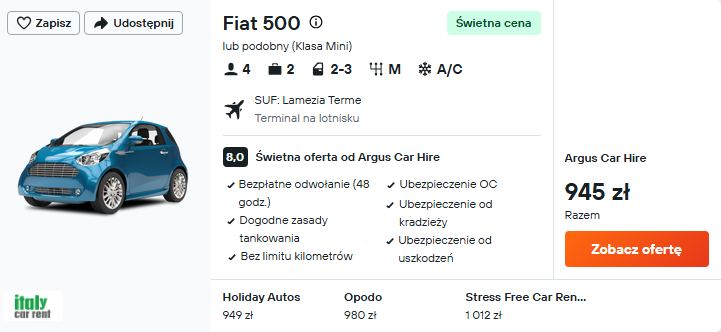 Od razu po wylądowaniu w Kalabrii wypożycz samochód, który pozwoli dotrzeć do wspomnianych powyżej miejsc oraz zachować swobodę zwiedzania. W tym miejscu znajdziesz propozycje wynajmu w Lamezii oraz Reggio.