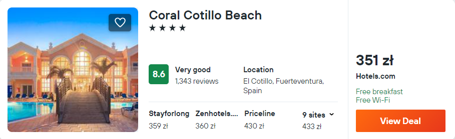 Na Fuerteventrzue proponuję ci noclegi z codziennymi śniadaniami w 4* hotelu Coral Cotillo Beach, który od plaży oddalony jest o 50 metrów. Na terenie obiektu znajduje się odkryty basen. We wszystkich pomieszczeniach będziesz mieć zapewniony dostęp do sieci WiFi.