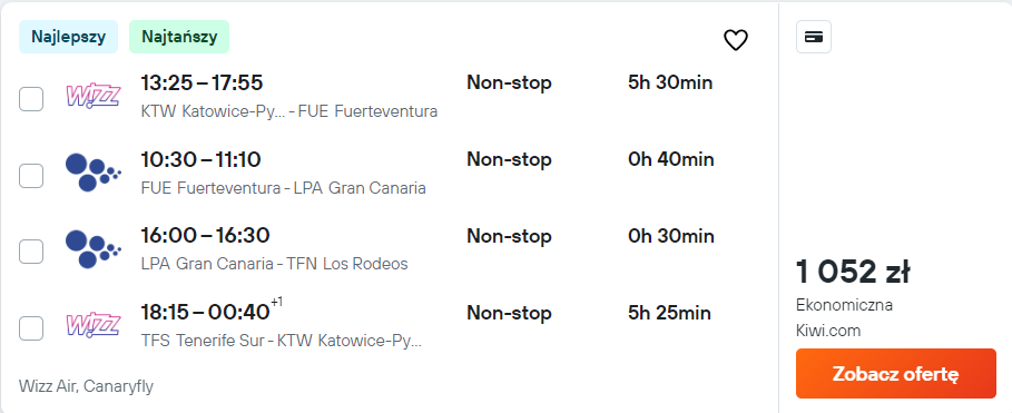 Wyjazd na popularne „Kanary” rozpoczniesz i zakończysz w katowickim porcie lotniczym im. Wojciech Korfantego. Podróż składa się z czterech przelotów (Katowice-Fuerteventrua, Fuerteventrua-Gran Canaria, Gran Canaria-Teneryfa oraz Teneryfa-Katowice), które zarezerwujesz jednym kliknięciem.