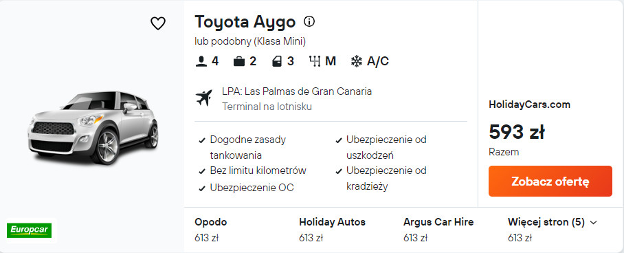 Na każdej z tytułowych wysp warto wypożycz samochód, który ułatwi eksplorację i przemieszczanie się po niej. Na przykład na Gran Canarii za wynajem Toyoty Aygo (lub podobnego modelu) zapłacisz 198 PLN/doba.