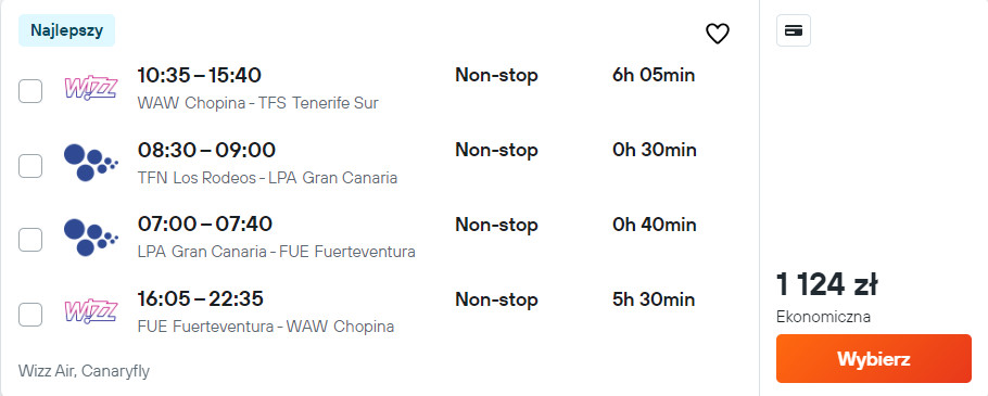 Wycieczkę rozpoczniesz i zakończysz na warszawskim lotnisku im. Fryderyka Chopina. Składa się ona z czterech niezależnych przelotów (Warszawa-Teneryfa, Teneryfa-Gran Canaria, Gran Canaria-Fuerteventura, Fuerteventura-Warszawa), które zarezerwujesz jednym kliknięciem.