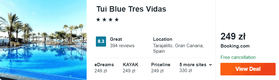 Dowiedzcie się więcej o tym hoteluNa Gran Canarii proponuję wam noclegi w 4* Tui Blue Tres Vidas, który położony jest w miejscowości Playa del Aguila. Na miejscu zakwaterowani będziecie w gustownie urządzonych apartamentach składających się z aneksu kuchennego, miejsca do relaksu, sypialni oraz łazienki.