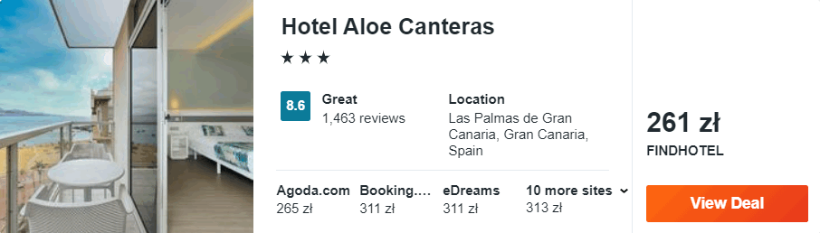 Dowiedzcie się więcej o tym hoteluNa Gran Canarii proponuję wam zakwaterowanie w 3* hotelu Aloe Canteras, który znajduje się w mieście Las Palmas przy plaży Canteras. Wszystkie pokoje zostały nowocześnie urządzone i wyposażone w klimatyzację, telewizor LCD oraz czajnik elektryczny.