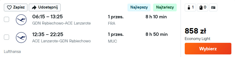 Na Lanzarote polecisz z Gdańska, Katowic, Krakowa, Poznania, Warszawy oraz Wrocławia w grudniu. W obie strony podróżować będziesz linią Lufthansa z przesiadkami we Frankfurcie lub Monachium. Na wyspę udasz się z bagażem podręcznym oraz przedmiotem osobistym.
