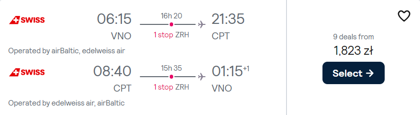 Do Republiki Południowej Afryki udasz się z portu lotniczego w Wilno w okresie wrzesień-październik. W obie strony polecisz na pokładach samolotów linii Air Baltic oraz Edelweiss Air z przesiadkami w Zurychu. Bez dodatkowych kosztów do Kapsztadu podróżować będziesz z bagażem podręcznym oraz przedmiotem osobistym (mały plecak lub damska torebka).