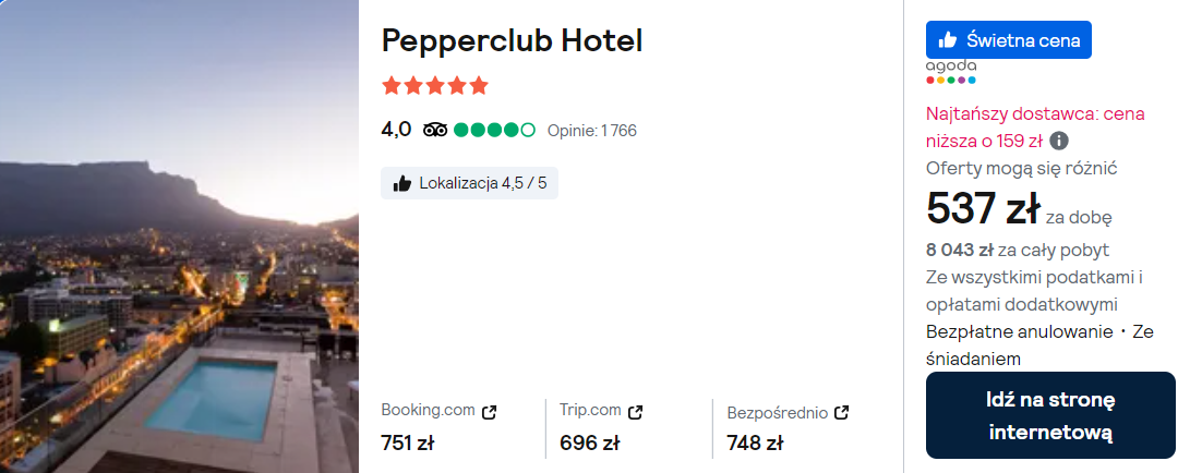 Możesz także rozważyć pobyt w 5* hotelu Pepperclub z odkrytym basenem na dachu. W cenie zapewnione będziesz miał codzienne śniadania oraz dostęp do sieci WiFi.