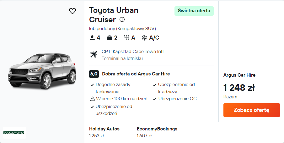 Na Przylądek Dobrej Nadziei czy do słynącego z przepięknych winiarni – Stellenbosch – dojedziesz wygodnie autem. Dlatego zachęcam cię do wypożyczenia samochodu zaraz po przylocie do Kapsztadu.