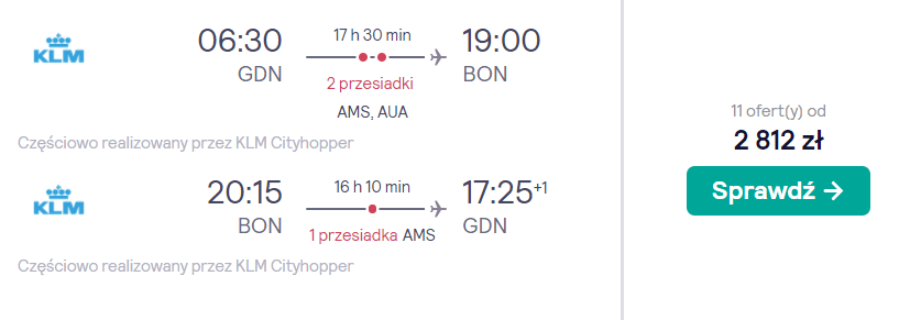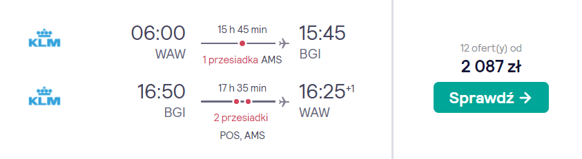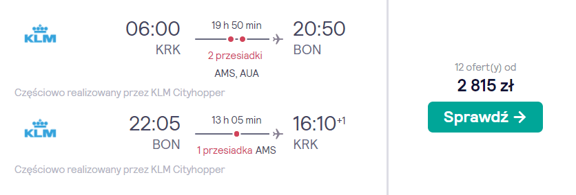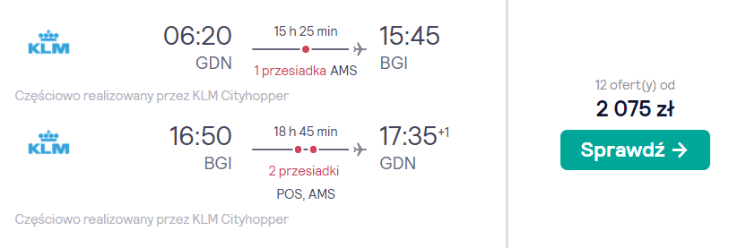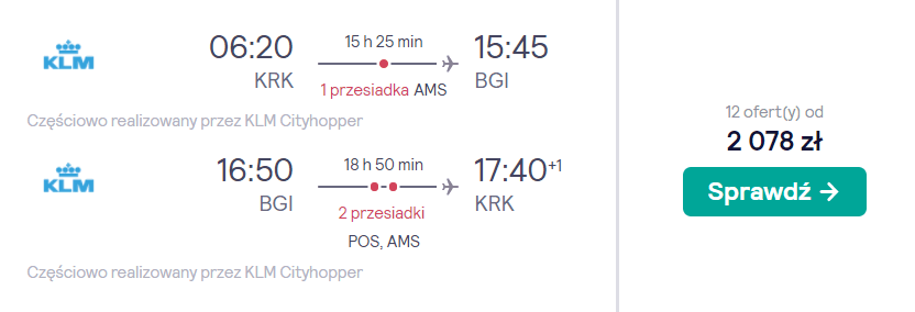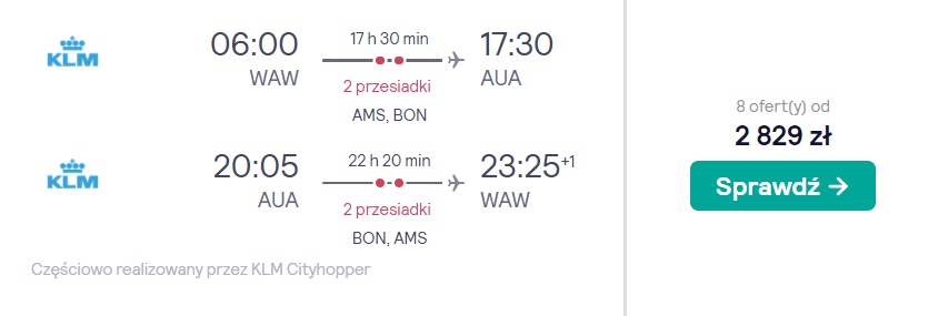 Na słoneczne Karaiby wybrać się będziecie mogli z Gdańska, Krakowa oraz Warszawy w okresie pomiędzy październikiem, a marcem przyszłego roku – dostępnych jest wiele terminów, a część z nich znajdziecie wypisanych poniżej. Na Arubę, Barbados, Bonaire, Curacao oraz Sint Maarten udacie się na pokładach samolotów należących do holenderskiej linii KLM. Podróżując w każdą ze strony, czekać was będą wygodne przesiadki na lotnisku w Amsterdamie oraz w niektórych przypadkach stopy techniczne na Karaibach.
