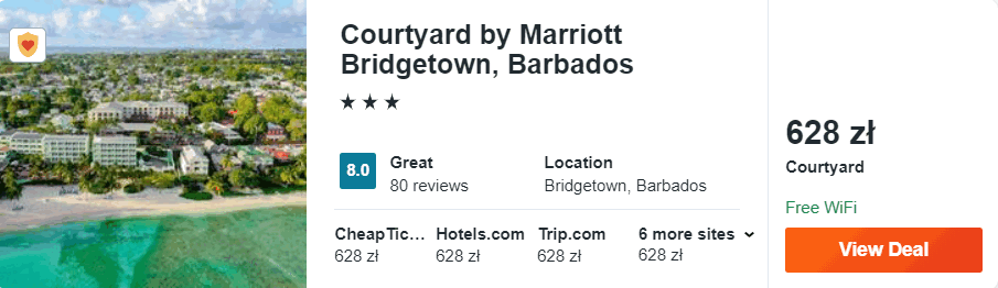 Dowiedzcie się więcej o tym hoteluNatomiast na Barbadosie rozważcie ofertę pobytu w fantastycznym 3* hotelu Courtyard by Marriott Bridgetown, który położony jest w zabytkowej dzielnicy Garrison, zaledwie 5 minut spacerem od plaży oraz 3 km od parku przyrody Graeme Hall Nature Sanctuary.