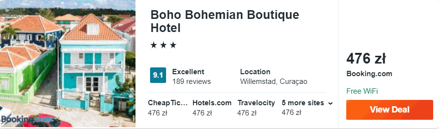 Na Curaco zatrzymajcie się w 3* hotelu Boho Bohemian Boutique, który znajduje się w miejscowości Willemstad. Na pobliską plażę Seaquarium dojdziecie z hotelu w ok. 10 minut spokojnym spacerem.