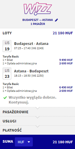 Wizz Air | Astana 18:15 – Budapeszt 18:50 | 9090 HUF (ok. 124 PLN) (WDC) | 23 listopada