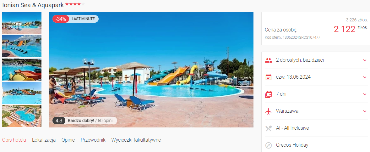 Spędzisz tydzień w 4* hotelu Ionian Sea & Aquapark. Na gości czeka rozległy kompleks basenów ze zjeżdżalniami, taras słoneczny, leżaki i parasole. Obiekt oferuje również specjalną ofertę rozrywkową dla najmłodszych.