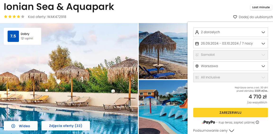 Spędzisz urlop w 4* hotelu Ionian Sea & Aquapark. Dla gości przygotowano rozległy kompleks basenów ze zjeżdżalniami, taras słoneczny, leżaki i parasole. Obiekt oferuje również specjalną ofertę rozrywkową dla najmłodszych.