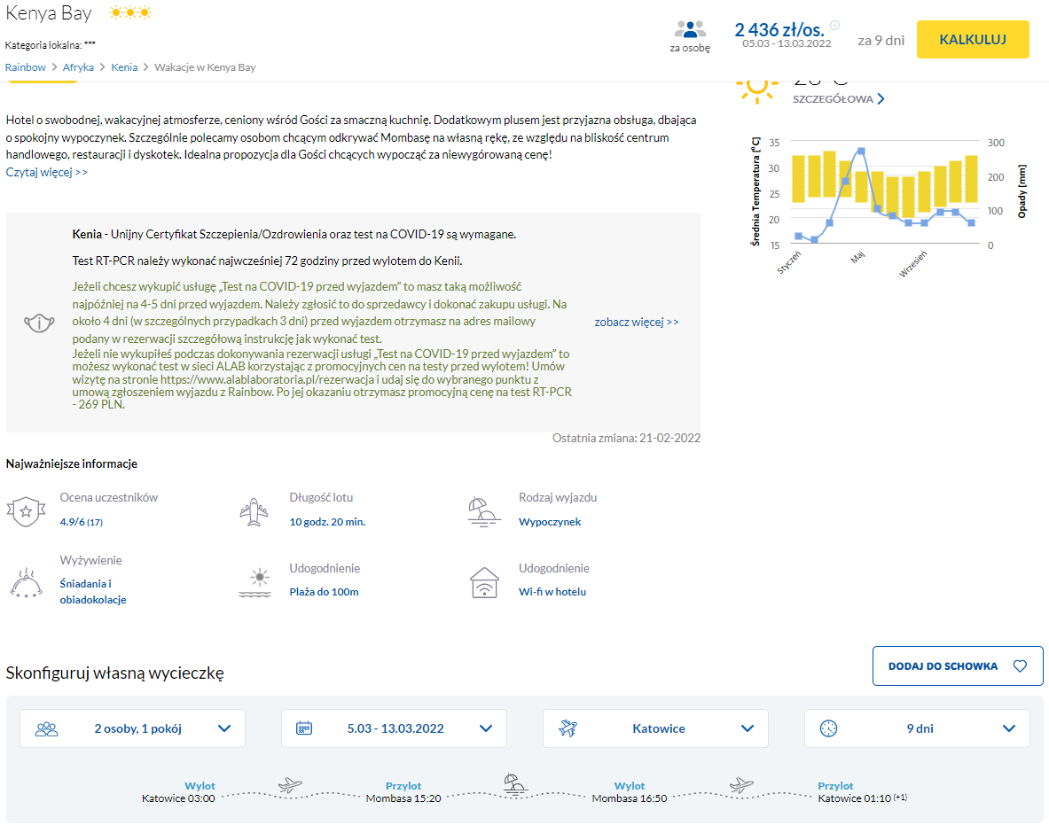 W podróż do Afryki udacie się jeszcze w tym tygodniu, w terminie 5 – 13 marca. Czeka was bezpośredni lot z Katowic lub Warszawy do Mombasy, realizowany na pokładzie samolotu linii lotniczej Smartwings. W cenę wliczono bagaż rejestrowany (nadawany do luku).