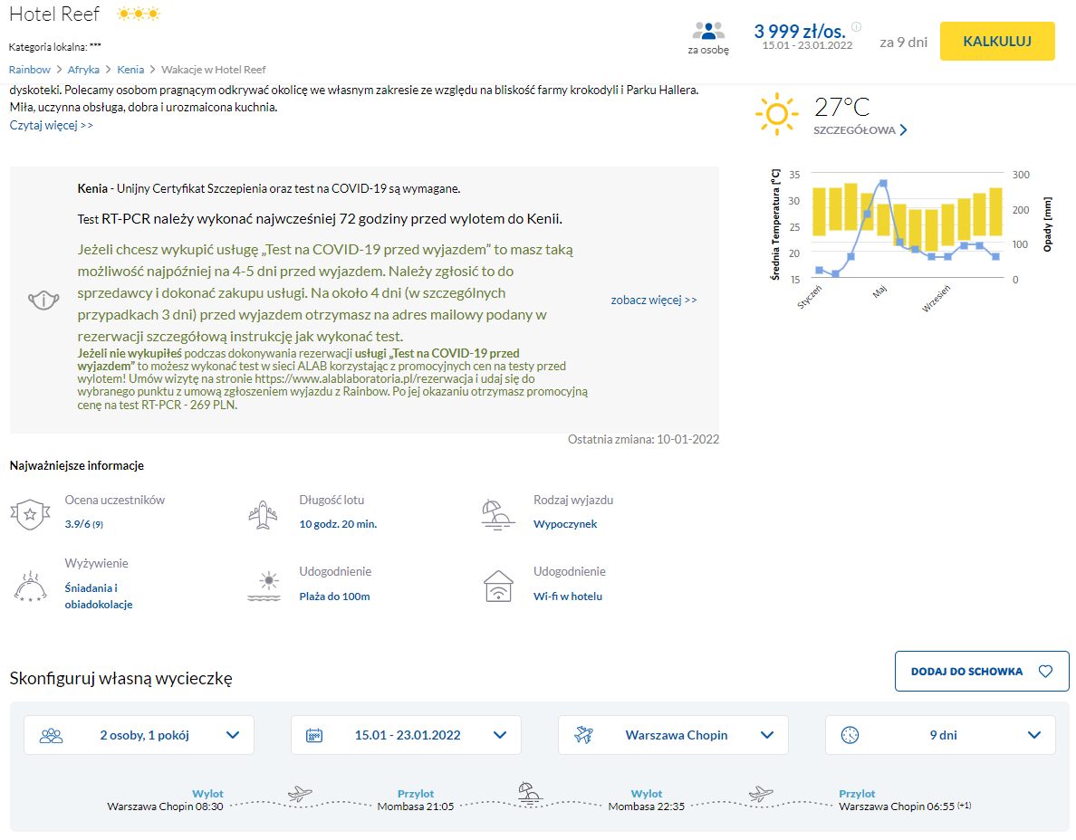 Na wycieczkę do Kenii wybierzecie się w terminie 15 – 23 stycznia. Czeka was bezpośredni lot z Warszawy do Mombasy, realizowany na pokładzie samolotu linii lotniczej Enter Air. W cenę wliczono bagaż rejestrowany – tym razem nie będzie problemu ze spakowaniem się oraz zmieszczeniem wszystkich pamiątek.