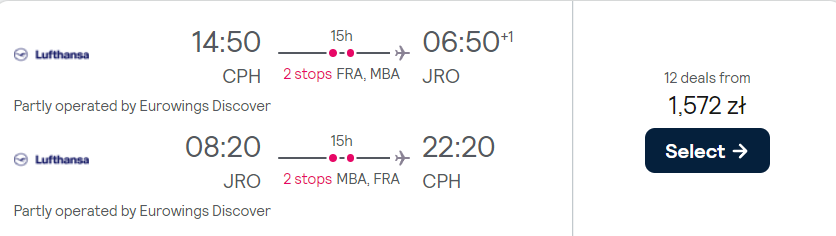 Twój wyjazd odbędzie się w terminie 18-29 kwietnia przyszłego roku z lotniska w Gdańsku. Pierwszym etapem jest przelot do Kopenhagi. Następnie czeka cię podróż do Kilimandżaro z bezpiecznymi przesiadkami we Frankfurcie i stopem technicznym w Mombasie. Skorzystasz z usług linii lotniczych SAS i Lufthansa, a bez dodatkowych kosztów zabierzesz ze sobą bagaż podręczny i przedmiot osobisty.