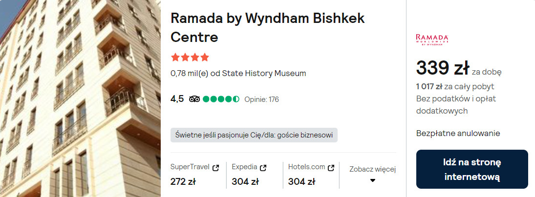 W stolicy Kirgistanu proponuję ci noclegi w 4* hotelu Ramada by Wyndham Bishkek Centre. Każdy pokój wyposażony jest w klimatyzację z funkcją ogrzewania, telewizor LCD oraz minibar. W łazience jest prysznic oraz suszarka do włosów.