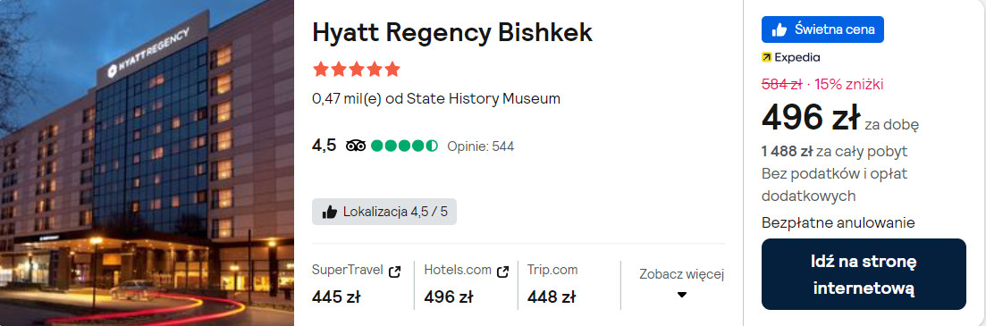 Niewiele więcej zapłacisz za zakwaterowanie w 5* hotelu Hyatt Regency Bishkek. Każdy pokój składa się z części do relaksu i spania. W łazience jest wanna z prysznicem.