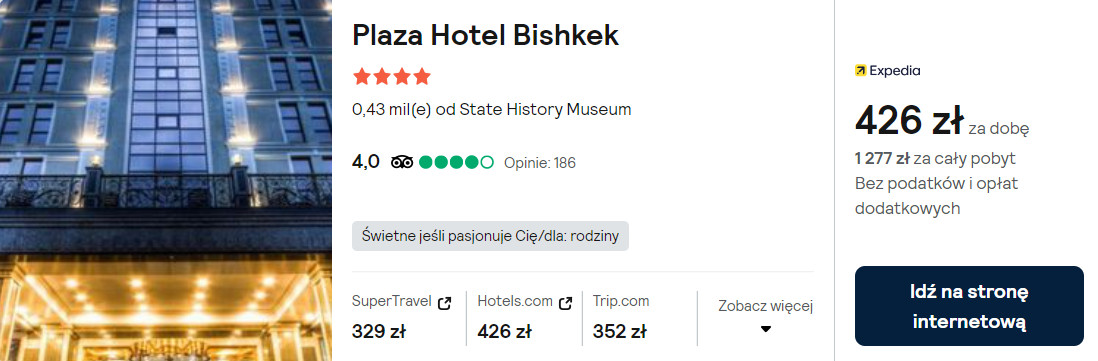 Możesz także postawić na pobyt w 4* hotelu Plaza Bishkek z krytym basenem. We wszystkich pomieszczeniach zapewniony będziesz mieć dostęp do sieci WiFi.