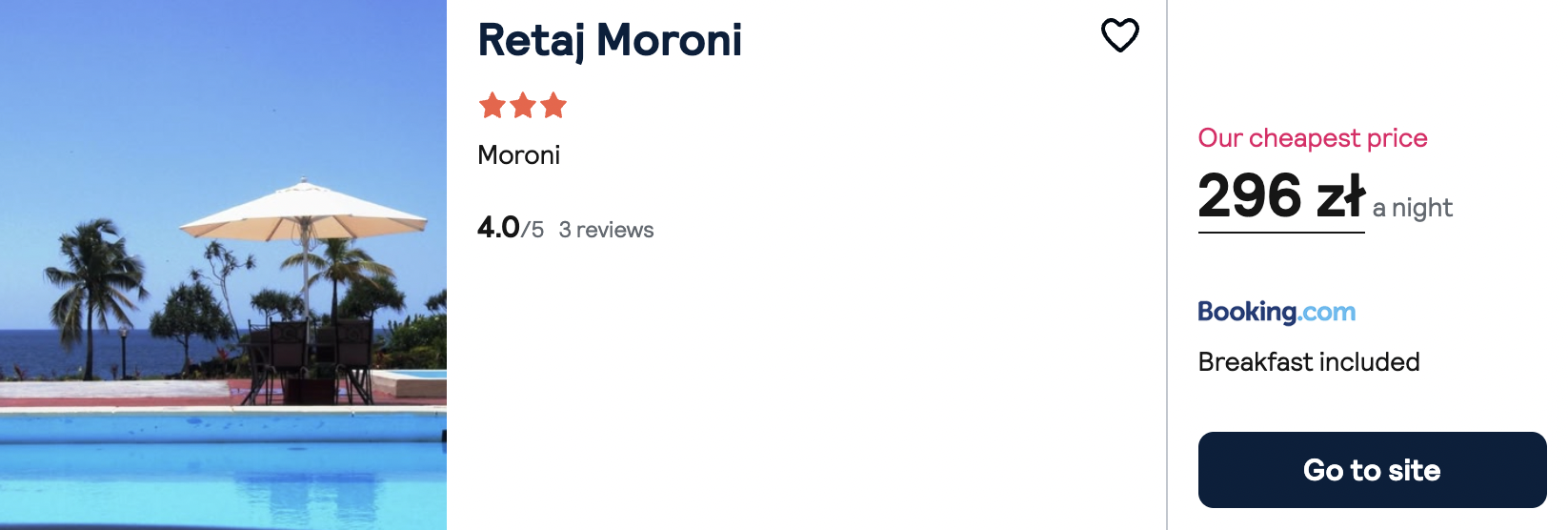 Natomiast na Komorach rozważ pobyt w 3* Retaj Moroni. W cenę noclegów wliczone są śniadania.