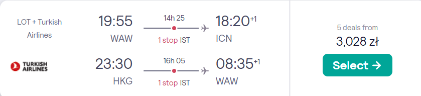 Twoja podróż rozpocznie się 7 listopada na lotnisku w Warszawie, kiedy to polecisz do Korei Południowej. Po drodze czeka cię przesiadka w Stambule. W Seulu zostaniesz do 12 listopada, po czym udasz się do Hongkongu. Powrót do Polski zaplanowano na 17 listopada. Bez dodatkowych opłat całą wycieczkę odbędziesz z bagażem podręcznym i przedmiotem osobistym.