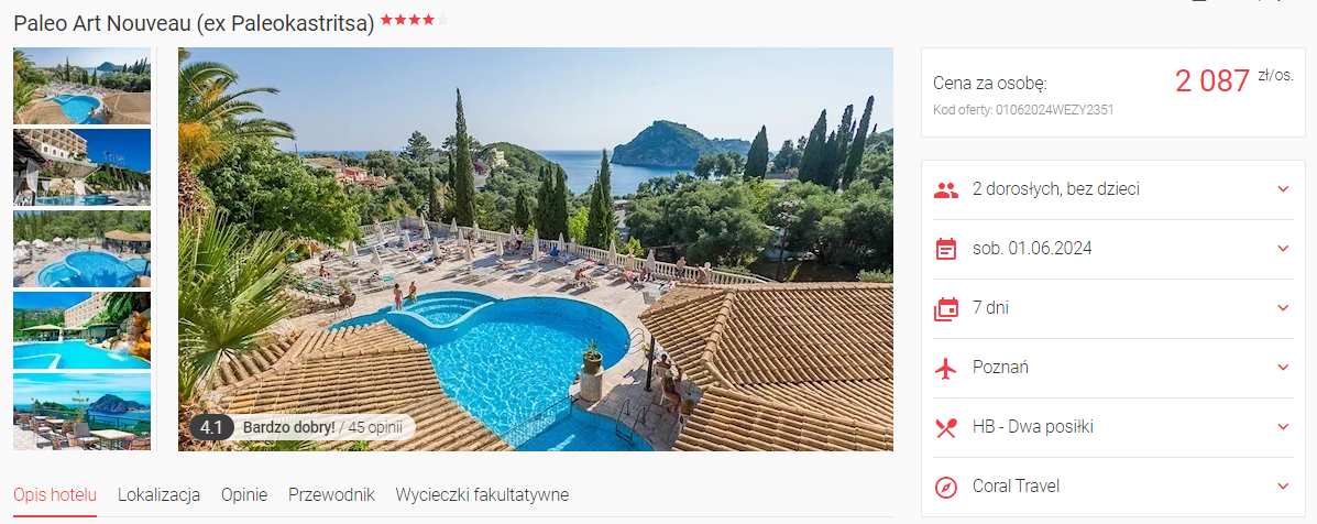 Spędzisz tydzień w eleganckim 4* hotelu Paleo Art Nouveau. Do twojej dyspozycji będzie odkryty basen ze wspaniałym widokiem na pobliską zaokę, przestronne pokoje oraz taras.