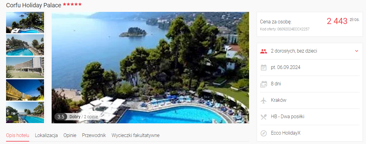 8-dniowy urlop spędzisz w 5* hotelu Corfu Holiday Palace. Obiekt oferuje odkryty basen ze wspaniałym widokiem na pobliską zatokę, bogate zaplecze sportowe, elegancko urządzone pokoje oraz lokalizację bezpośrednio przy plaży.