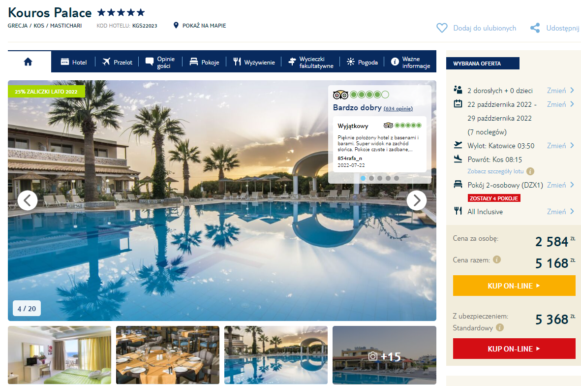 Do Grecji udacie się w terminie 22 – 29 października. Czeka was bezpośredni lot na wyspę Kos, a jako miejsce wylotu możecie wybrać Warszawę, Poznań lub Katowice. W cenę pakietu wliczono bagaż rejestrowany (nadawany do luku).
