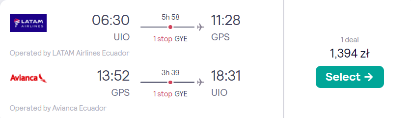 Twój wyjazd do Ameryki Południowej i Środkowej odbędzie się w terminie 26 kwietnia – 17 maja. W tych dniach czekają cię loty z Berlina do San Jose i z powrotem. W Kostaryce będziesz do 2 maja, po czym udasz się do Bogoty. Następnie wybierzesz się do Quito (4 maja). Ze stolicy Ekwadoru czeka cię wycieczka na wyspy Galapagos w dniach 5-12 maja. Do Kostaryki wrócisz 15 maja. Podróżować będziesz na pokładzie samolotów linii lotniczych Iberia, Latam, Wingo i Avianca.