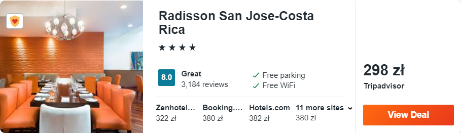 Po przylocie do Kostaryki kilka pierwszych dni rekomenduję wam spędzić w San Jose. W mojej ocenie najlepszym miejscem na nocleg będzie 4* Radisson San Jose-Costa Rica, który od centrum miasta oddalony jest o nieco ponad 1 km. Na miejscu czekają przestronne pokoje wyposażone w klimatyzację, telewizor LCD oraz zestaw do parzenia kawy lub herbaty. Ponadto w cenie noclegu będziecie mogli korzystać z odkrytego basenu oraz krytego z podgrzewaną wodą.