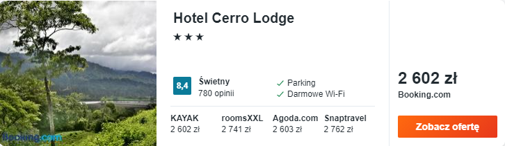 W Kostaryce proponuję od razu opuścić San Jose i ruszać do wewnętrznej części kraju. Wybrałem dla was świetnie oceniany 3* hotel Cerro Lodge. Piękny, zielony ogród z basenem, wspaniałe widoki na okoliczne góry oraz oczywiście bezpośrednia bliskość dziewiczej przyrody – oto, dlaczego powinniście skusić się na tę propozycję.