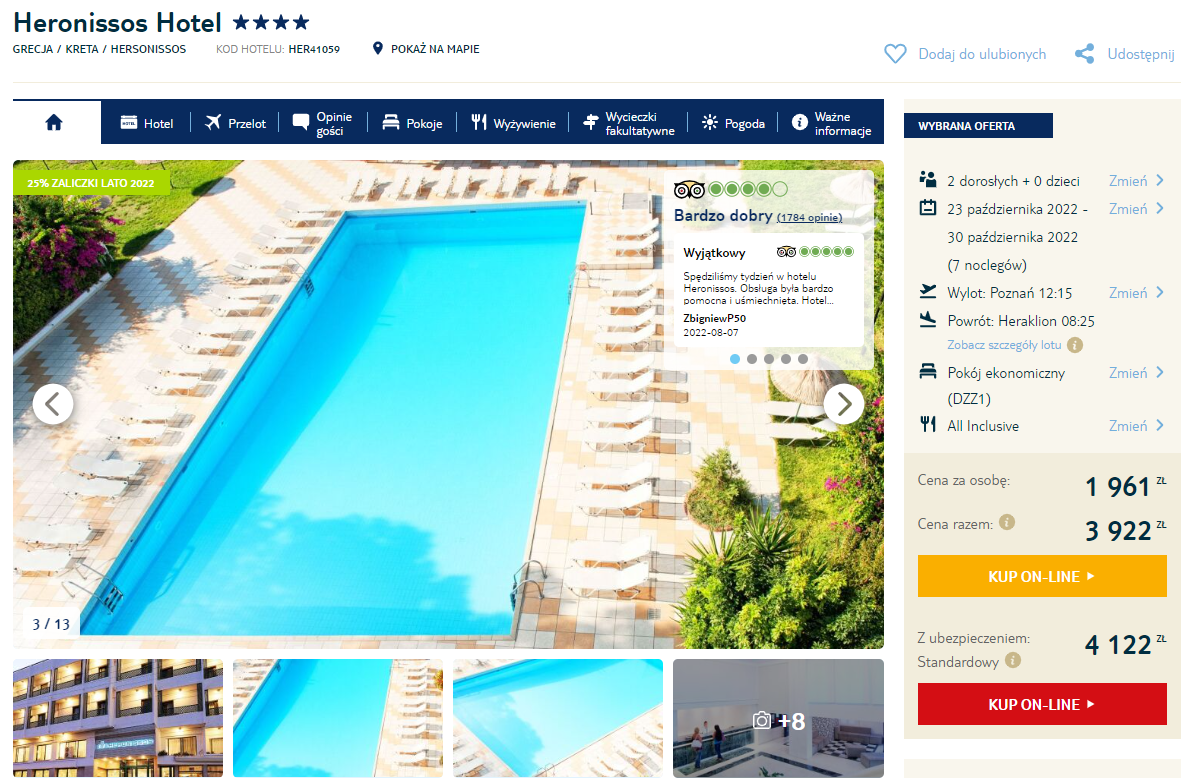 Do Grecji udacie się w terminie 23 – 30 października. Czeka was bezpośredni lot z Katowic, Poznania lub Warszawy do Heraklionu, realizowany na pokładzie samolotu linii lotniczej Enter Air. W cenę pakietu wliczono bagaż rejestrowany (nadawany do luku).