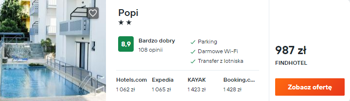 Wybrałem dla was zakwaterowanie w bardzo dobrze ocenianym hotelu Popi. To kameralny, rodzinny obiekt położony niedaleko plaży. W czasie gorącego dnia dodatkowo będziecie mogli schłodzić się w odkrytym basenie.