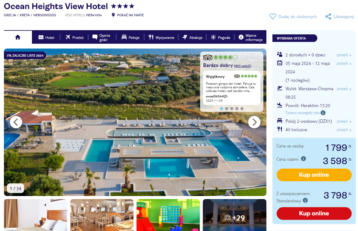 Urlop w Grecji zaplanowany został dopiero w terminie 5 – 12 maja przyszłego roku. Czeka cię bezpośredni lot do Heraklionu, realizowany na pokładzie samolotu linii lotniczej Enter Air. W cenę wliczono podróż z bagażem rejestrowanym (nadawanym do luku).