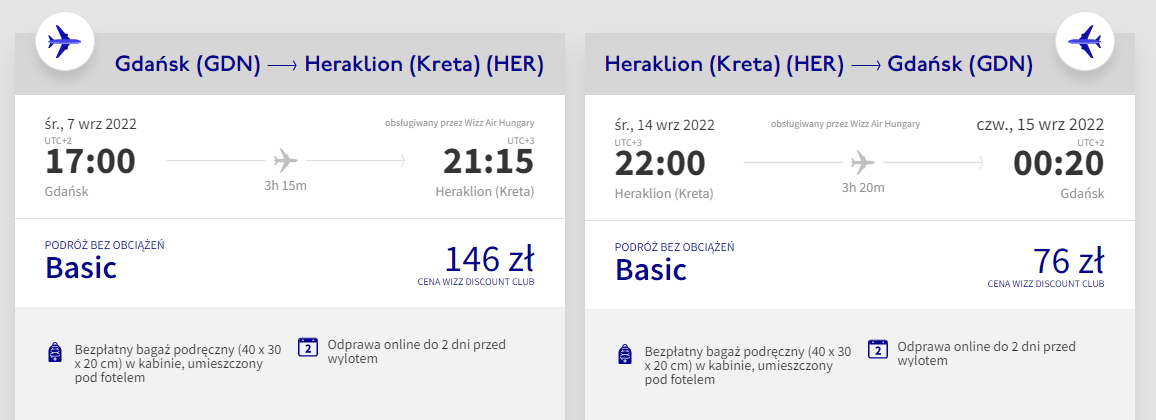 Do Grecji udacie się w czasie kalendarzowego lata, w terminie 7 – 14 września. Czeka was bezpośredni lot z Gdańska do Heraklionu, realizowany na pokładzie samolotu linii lotniczej Wizz Air. Bilety w najniższej cenie zakupią posiadacze Wizz Discount Club, pozostałe osoby zapłacą nieco więcej.