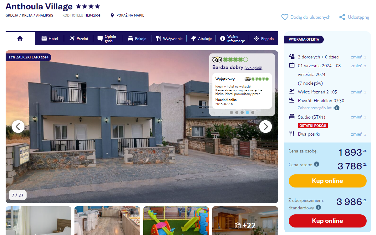 Spędzisz tydzień w bardzo dobrze ocenianym, kameralnym 4* hotelu Anthoula Village. Dla gości przygotowano nowocześnie wyposażone, klimatyzowane pokoje, 2 baseny, taras słoneczny oraz kącik zabaw dla najmłodszych. Najbliższa plaża znajduje się 200 m od obiektu.