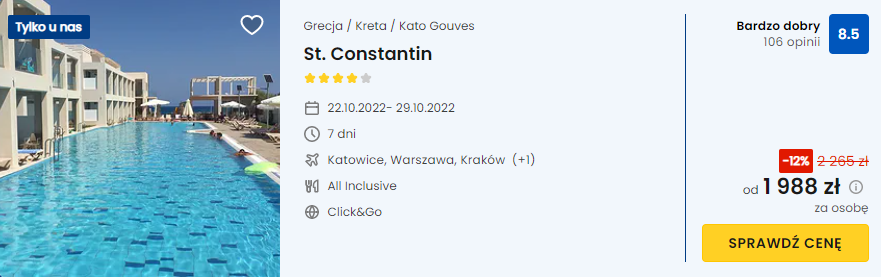 Będziecie zakwaterowani w bardzo dobrze ocenianym 4* hotelu St. Constantin. Położony w malowniczej okolicy, tylko 100 m od plaży będzie świetnym miejscem na wypoczynek. Na miejscu czekają klimatyzowane pokoje, odkryty basen oraz restauracja serwująca specjały kuchni śródziemnomorskiej w wydaniu all inclusive.