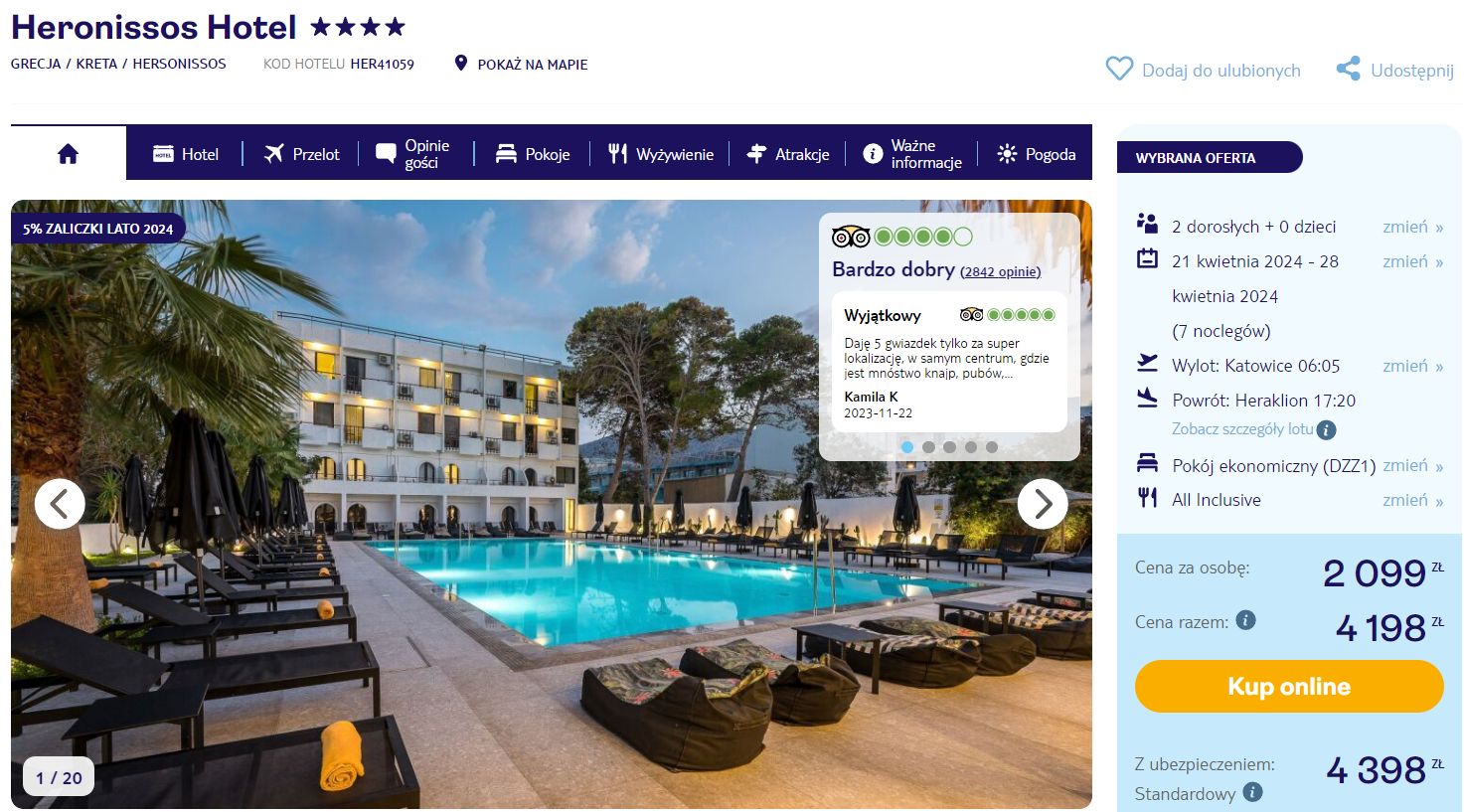 Urlop w Grecji odbędzie się w terminie 21-28 kwietnia. Czeka cię bezpośredni lot do Heraklionu, linią Enter Air. W cenę wliczono podróż z bagażem rejestrowanym (nadawanym do luku).