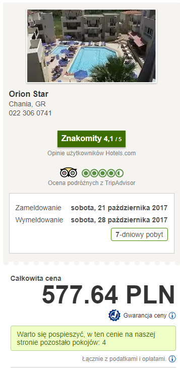 W terminie 21 – 28 października proponuję wybrać Orion Star za 578 PLN/2 osoby/7 nocy (289 PLN/osoba)